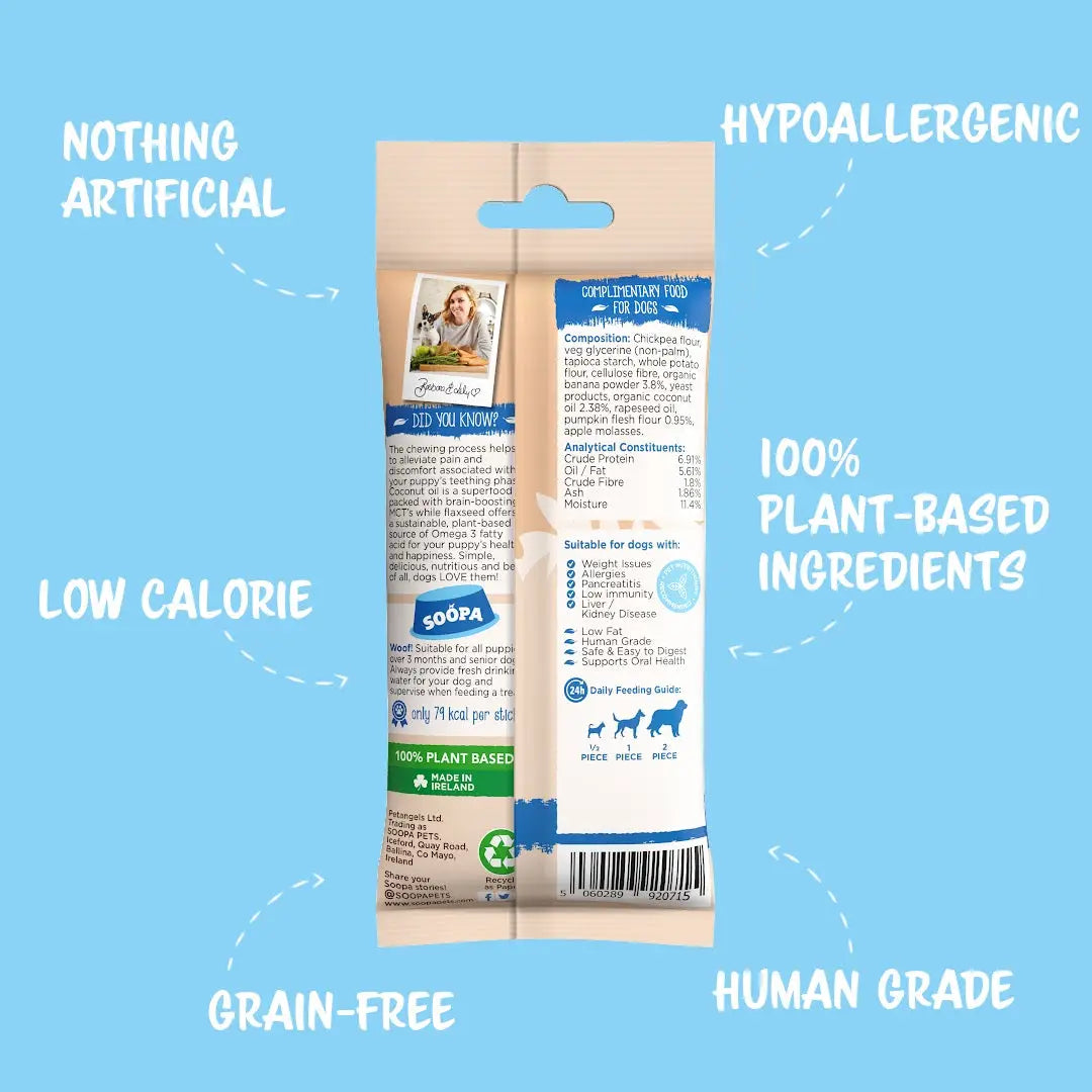 Vous recherchez une délicieuse friandise pour chien qui soit également saine ? Chez Soopa, nous comprenons l'importance de l'hygiène dentaire pour nos chiens. Avec notre gamme existante de produits à mâcher conçus pour aider les chiens à garder leurs dents en pleine forme, nous avons décidé de créer des produits à mâcher spécialement conçus pour ces jeunes chiots.