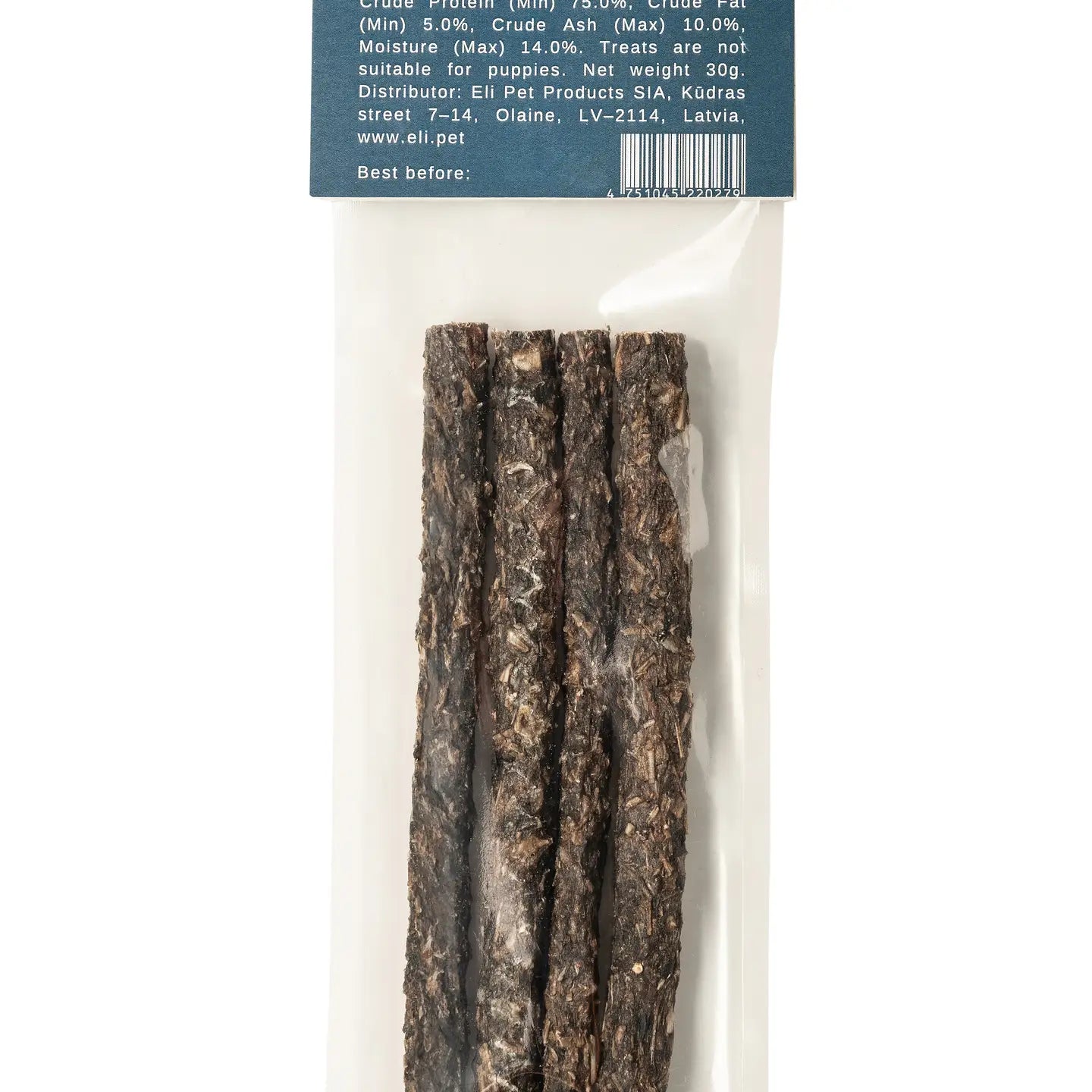 Viande de morue avec arêtes 95 %, myrtilles 5 % Taille du produit : Environ 13 – 14 cm, peut varier Texture : Croquante Date d'expiration : 24 mois Analyse garantie : Protéines brutes (Min) 75 %, Matières grasses brutes (Min) 5 %, Cendres brutes (Max) 10 %, Humidité (Max) 14 %