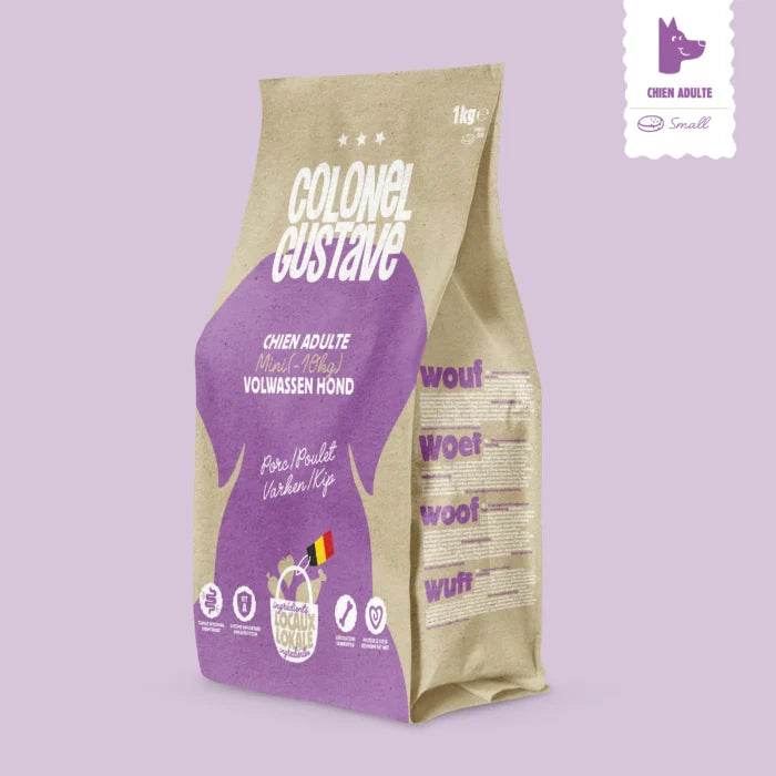 Croquettes pour petit chien adulte au porc/poulet.