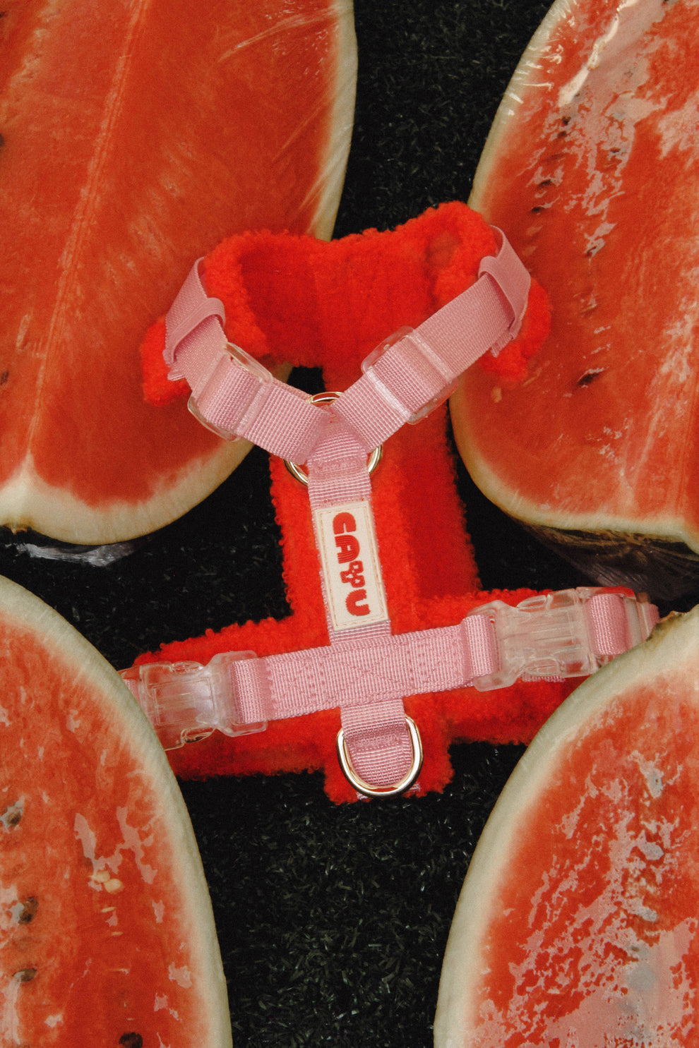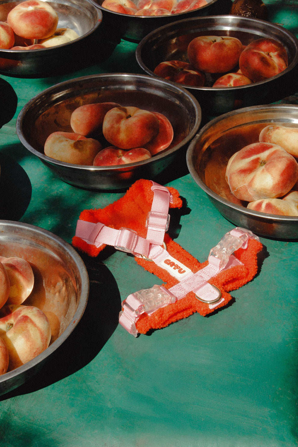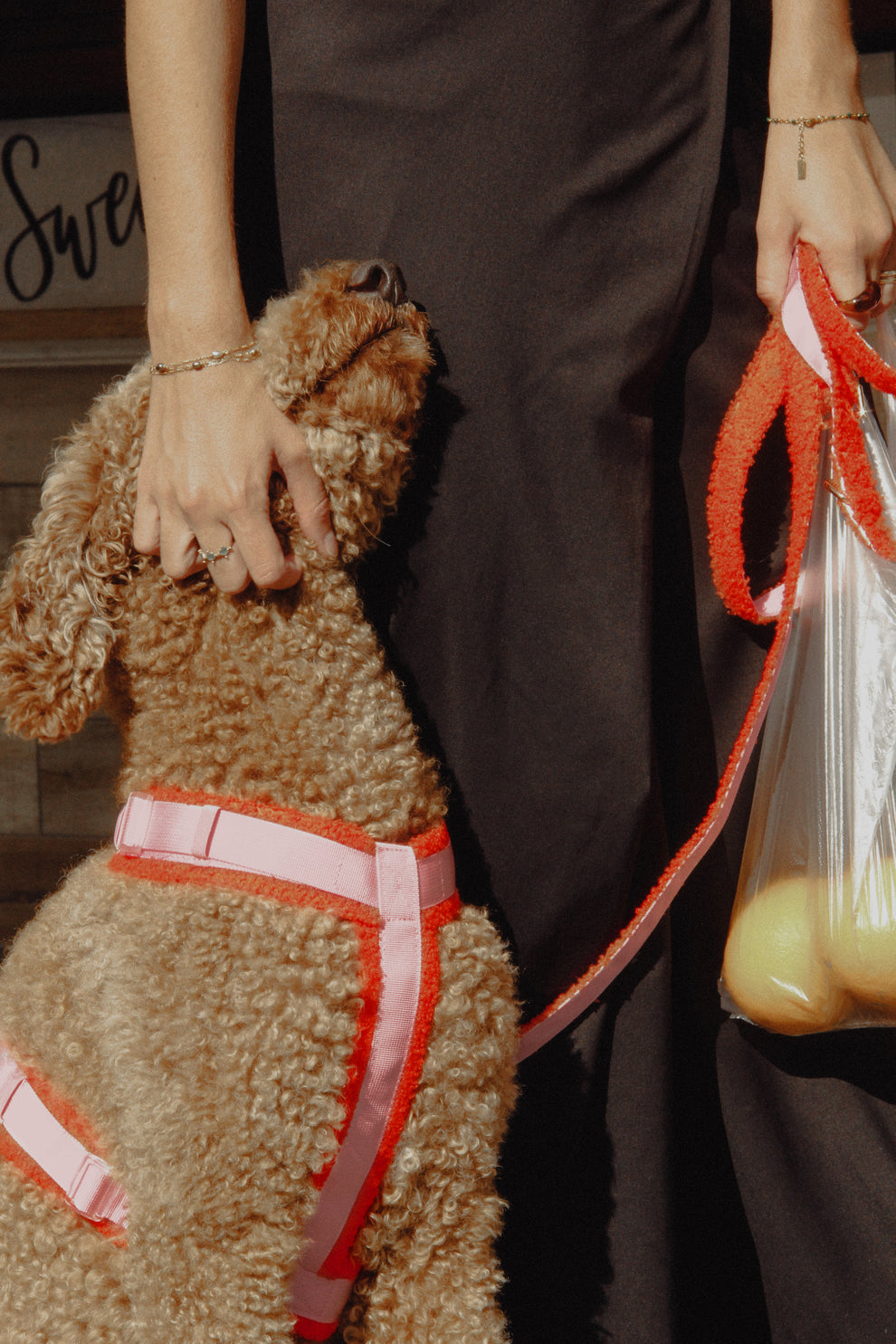 Les détails métalliques dorés apportent une touche élégante, et le contraste lumineux entre l’orange et le rose pâle offre à votre compagnon une allure joyeuse, moderne et unique à chaque promenade. Un harnais aussi agréable à porter qu’à regarder 🧡🌸🐕