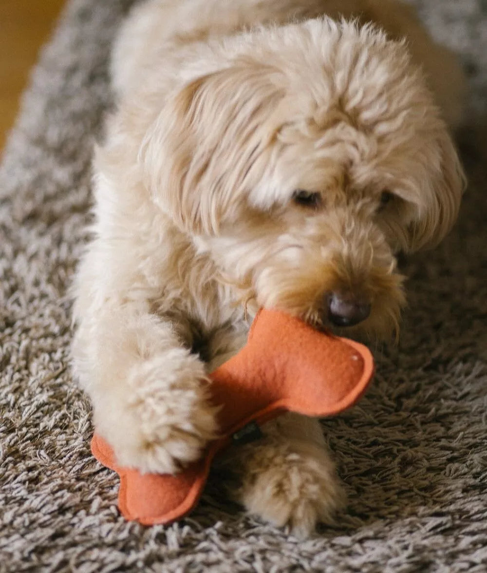 Jouet coussin en forme d'os fabriqué à la main en Europe avec du tissu et des fibres recyclées provenant de bouteilles en plastique.