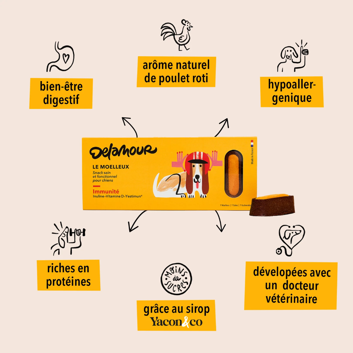 Conçu avec un Docteur vétérinaire spécialisé en nutrition animale, Le Moelleux est un snack pour chien parfaitement équilibré et adapté aux besoins spécifiques de chaque chien. Grâce à son délicieux arôme naturel de poulet rôti, notre pâtisserie artisanale allie plaisir et bien-être.