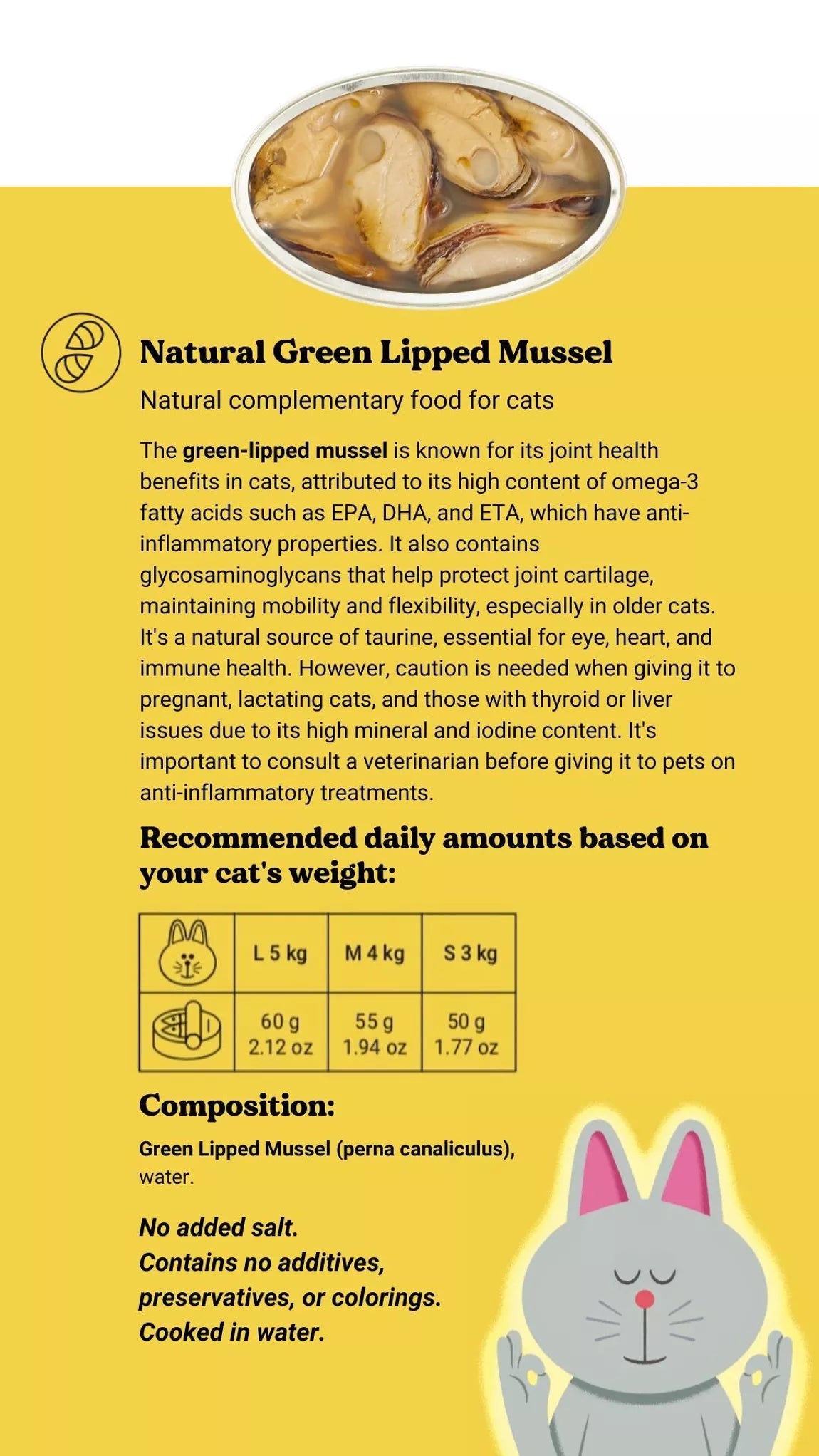 La moule à lèvres vertes contient également des glycosaminoglycanes, des composés essentiels à la protection du cartilage articulaire. Ils participent au maintien de la souplesse des articulations et à la préservation de la mobilité, en particulier chez les chats âgés ou sujets aux troubles articulaires.