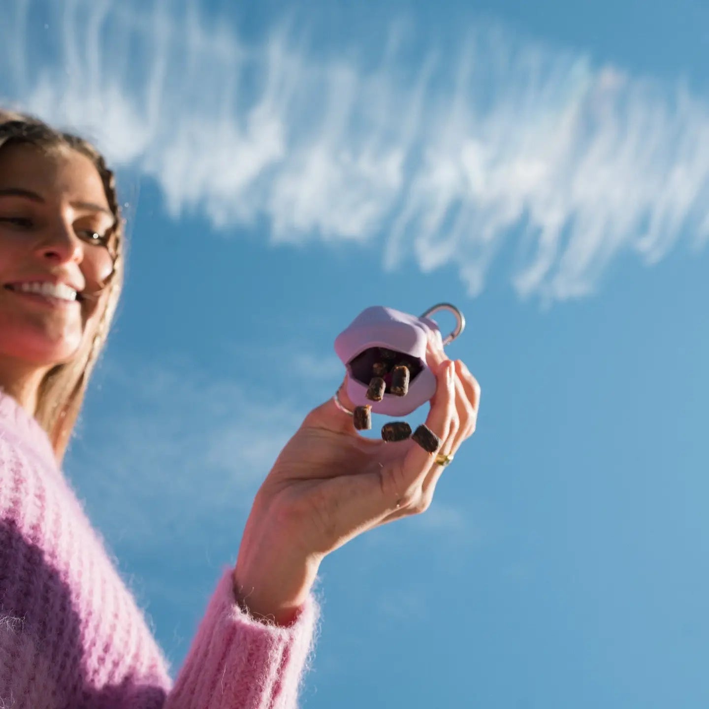Voici notre NOUVEAU distributeur de friandises pour chiens en silicone, de forme unique pour une compression sans effort. Ce distributeur de friandises pour chiens en silicone de qualité alimentaire vous permet de distribuer facilement quelques friandises à la fois, ce qui en fait un accessoire essentiel pour les promenades, l'entraînement et les récompenses sur le pouce. Il suffit de presser pour distribuer des friandises pour chiens ! Pour le remplir, pressez le distributeur avec la fente vers le haut et ajoutez des croquettes ou des friandises pour garder votre chiot motivé.